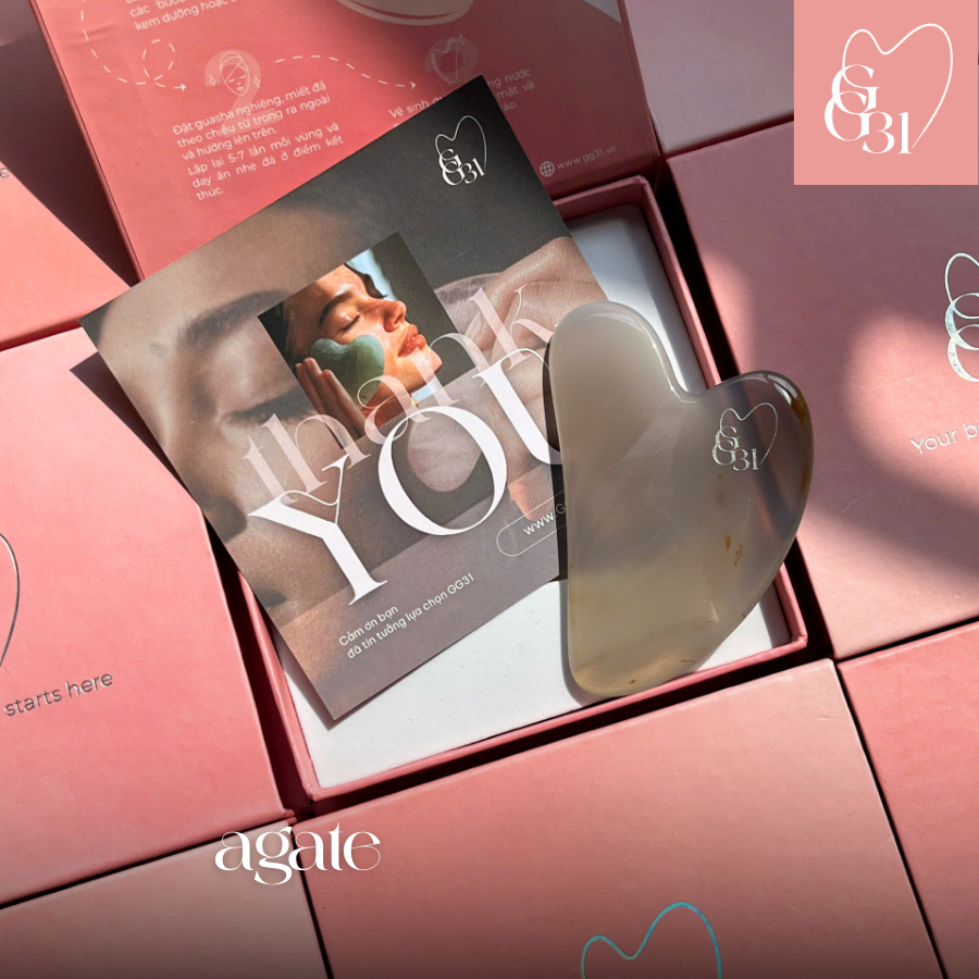 Guasha Agate của GG31 được chế tác từ đá Agate tự nhiên hay còn gọi là đá mã não tự nhiên, bề mặt mịn, độ cong chuẩn để tạo lực massage đều và sâu. Sản phẩm phù hợp cho cả người mới lẫn chuyên viên spa nhờ thiết kế tối giản, dễ thao tác và độ dày tối ưu để không gây đau da.