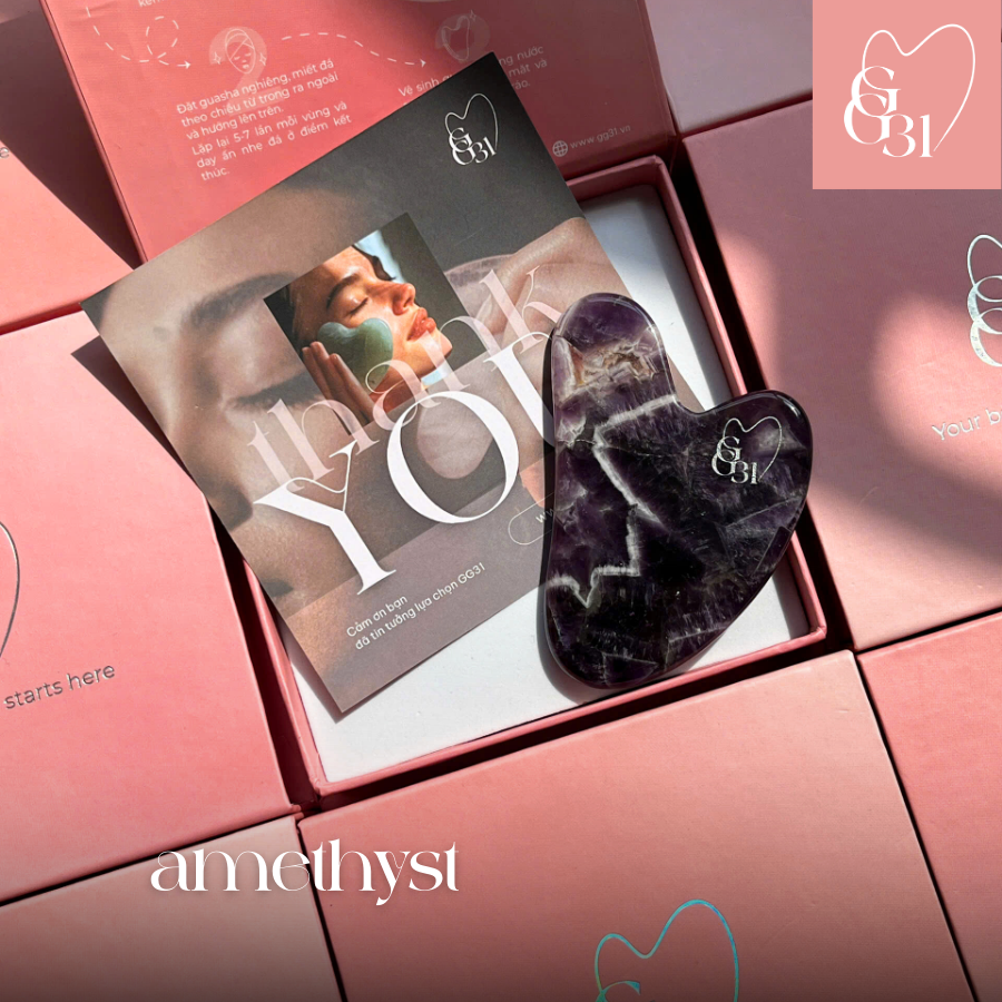 Guasha Thạch Anh Tím của GG31 được chế tác từ đá thạch anh Tím tự nhiên, bề mặt mịn, độ cong chuẩn để tạo lực massage đều và sâu. Sản phẩm phù hợp cho cả người mới lẫn chuyên viên spa nhờ thiết kế tối giản, dễ thao tác và độ dày tối ưu để không gây đau da.