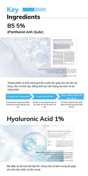 Sản phẩm kết hợp bộ 3 hoạt chất sinh học gồm Panthenol (Vitamin B5) 5%, Hyaluronic Acid 1% và SRGF H₁ Complex™, giúp cấp ẩm đa tầng, củng cố hàng rào da và tăng cường độ đàn hồi một cách bền vững.